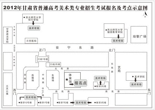 请各位考生及早熟悉考场安排,做好考试准备工作。凡考场安排在西北师范大学知行学院考点的考生,请及早熟悉行走路线,考务组将在报名点安排专人带考生前往知行学院考点;乘车时请在水挂庄桥下车,沿甘肃政法学院东面围墙往北行400米即到。凡考场安排在西北师范大学继续教育学院考点的考生,步行从培黎广场站往北走100米即到。报名及考点示意图如下: