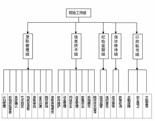 3.录取操作岗位分组及职责。下设录取管理组、信息技术组、纪检监察组、信访接待组、行政秘书组五个工作组,录取操作每个组设若干个岗位,实行组长负责制。其具体职责如下: