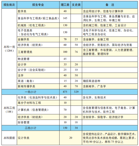 注:1. 北京一批各专业预留 20% 左右的计划招收非第一志愿高分考生,要求一批一志愿报考学校为“211”院校。