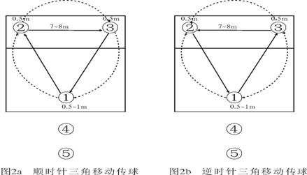 a.三角移动传球:距离为7m至8m。以考生按序号五至六人为一组测试,以技术评定形式进行。按顺时针传球方向,“①→②→③→①”(图2a),传球后人迅速移动到所传球人的位置,与传球方向相同,每个位置传十个球,高度不低于5m;然后按逆时针轮转,传球的方向“①→③→②→①”(图2b),每个位置传十个球,高度不低于5m。其主要考查4、2、6号位队员相互调整球的能力。