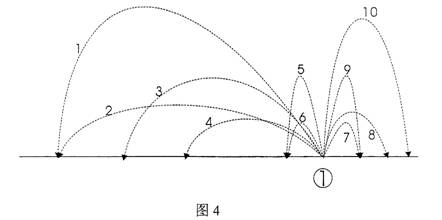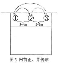 ②队员网前调整能力。之后,以顺时针方向从①→②→③→①,主要看③队员二次调整球能力。