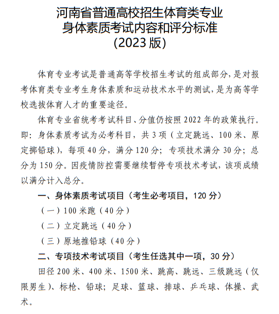 河南省普通高校招生体育类专业身体素质考试内容和评分标准(2023 版)点击下载