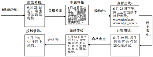 第三步.公布划线。6月28日下午,在“安徽招生考试网”(www.ahzsks.cn)和“中安国防网”(www.ahgfjy.com),公布参检分数线、心理测试和面试体检地点,考生自行上网查看。